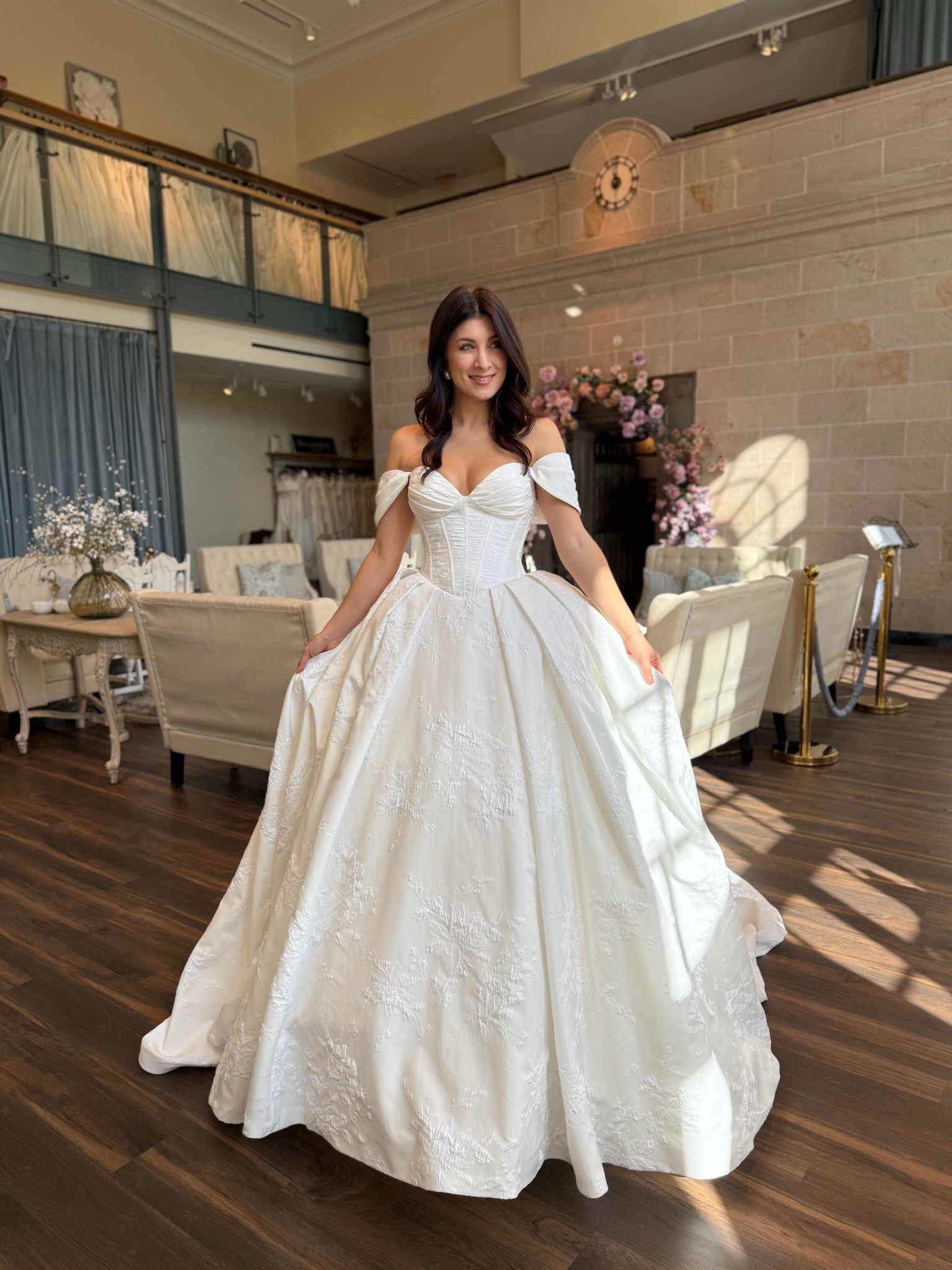 "Kessler" - Kessler is pure romance and gives all the fairytale energy in the very best way. This satin jacquard ball gown features off the shoulder sleeves, exposed boning, and a Basque waist, creating a silhouette that feels dreamy and undeniably princess worthy! If you’ve ever dreamed of wearing a dress that feels like it belongs in a storybook, Kessler is absolutely one to try on!