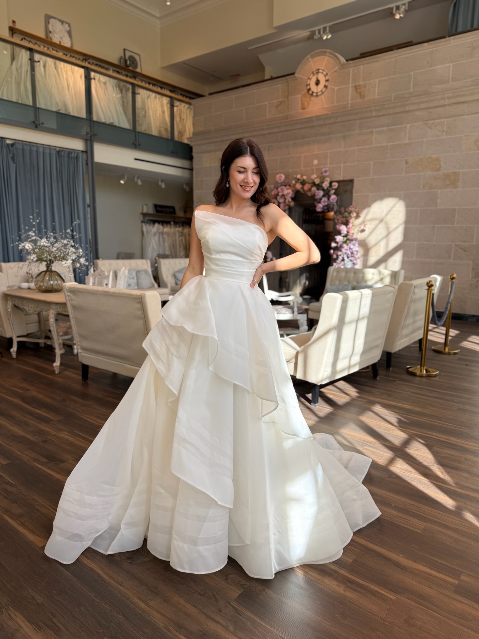 "Lennox" - Lennox is fashion forward in the very best way. Crafted from airy organza, each layer is finished with horsehair trim featuring a subtle striped effect. It’s not the first thing you notice, but it’s the kind of thoughtful detail that makes the gown feel elevated, intentional, and effortlessly editorial.