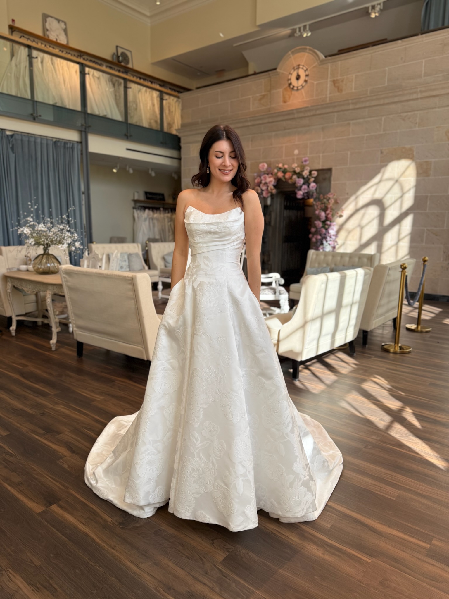 "Rosie" - Rosie truly makes our hearts sing. The floral jacquard fabric, the soft scoop neckline with a subtle cat eye shape — all of it comes together to create such a gorgeous, delicately feminine feel. And those clean, stunning lines across the bodice? Absolute perfection. Brides love that Rosie is a slim A line, meaning you still get a beautiful bridal silhouette without the heavy, ultra voluminous feel in the skirt. She’s the perfect in-between gown when you want movement and romance without going full ball gown!