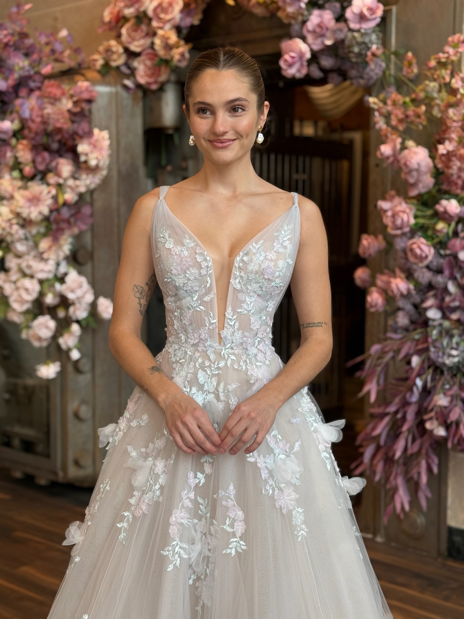 "Lenora" – Lenora is soft, romantic, and effortlessly enchanting. This airy A line wedding dress features delicate floral appliqués that cascade from the illusion bodice into the flowing tulle skirt, creating beautiful texture and movement with every step. The plunge neckline and slender straps add a modern, feminine touch while keeping the overall look light, graceful, and undeniably dreamy. Brides visiting our bridal shop in Fredericksburg VA often fall in love with Lenora for its whimsical, garden inspired feel.