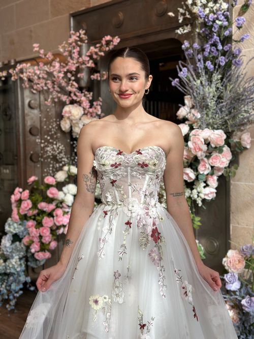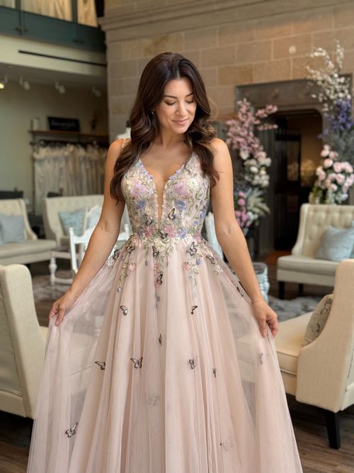 "Yara" – Yara is whimsical, romantic, and beautifully detailed. This dreamy A line wedding dress features colorful floral embroidery across the illusion bodice that gently flows into the soft tulle skirt, creating a garden inspired feel. Delicate butterfly accents throughout the gown add an enchanting, storybook touch that makes Yara feel truly magical from every angle. It is a favorite among brides visiting our bridal shop in Fredericksburg VA who are searching for something unique, romantic, and full of personality.
