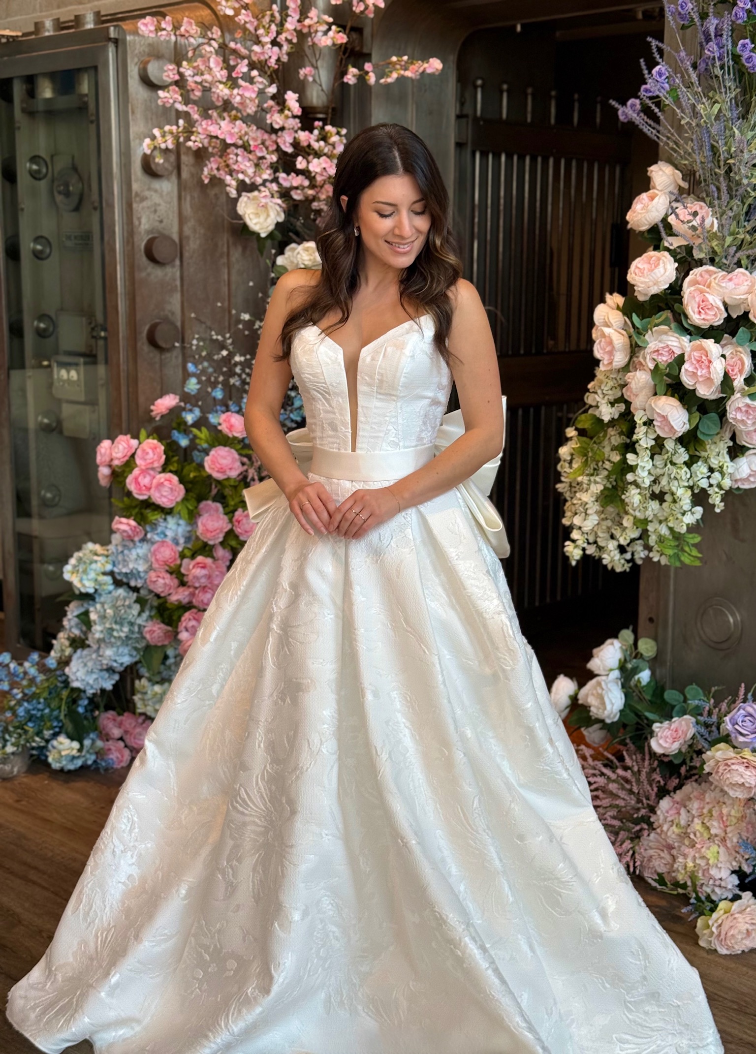 "Tyler” – A striking jacquard ballgown with a peaked plunging neckline, buttons down the full train, and a dramatic, clean bow with a sash that flows down the train!