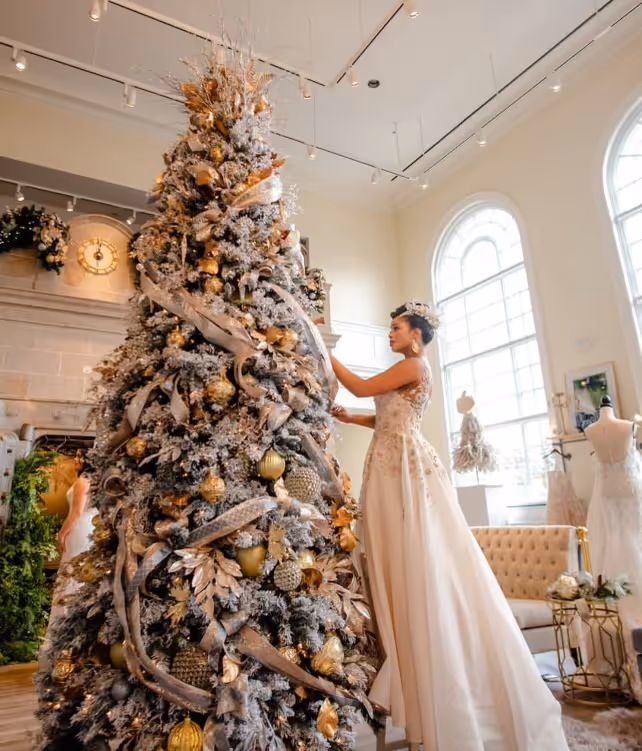 The holiday transformation at Ava Laurénne Bride is no small feat. It takes an entire team of stylists, staff, and even their families to bring the vision to life. Decorating parties have become a tradition, with volunteers coming together to help fluff trees, hang garlands, and add those magical finishing touches! The atmosphere is one of camaraderie, with pizzas ordered and families helping out, making it a joyful event that reflects the spirit of the season!